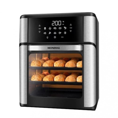 A Fritadeira Elétrica Forno Oven 12L Mondial conta com controle de temperatura que proporciona a escolha de temperatura ideal para diferentes tipos de alimentos. Contém timer de 90min que desliga automaticamente ao término do preparo e painel digital com 10 funções pré-definidas. Prepara: Batata, frango, carne, peixe, camarão, pão de queijo, pizza, bolo, legumes e tem a função reaquecer. Inclui bandeja coletora de resíduos, gerando praticidade ao limpar. Cesto de 5 litros, mais facilidade para servir as porções. Com aberturas laterais, melhora o fluxo de ar e assa por igual. Assadeiras com revestimento antiaderente, ideal para preparar pão de queijo, nuggets, pizza e muito mais.