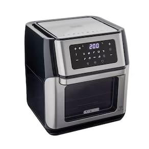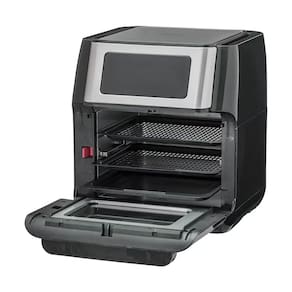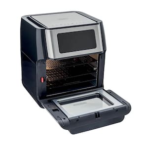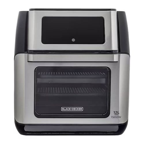 Fritadeira Elétrica Air Fryer 5 em 1 com funções de assar, tostar, desidratar, rotisserie e fritar sem óleo. Possui 10 funções pré-programadas, desligamento automático, iluminação interna e acessórios inclusos.Porta-fio
