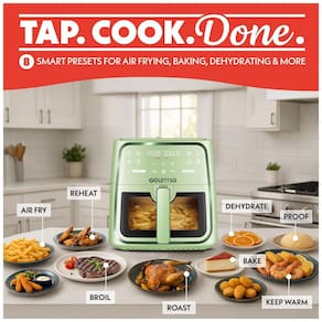 A cuba conta com janela frontal ampliada e iluminação interna, permitindo visualizar o alimento durante o preparo sem a necessidade de abrir o cesto. O painel digital com comandos por toque oferece 8 programas de um toque: Air Fry, Bake, Roast, Broil, Dehydrate, Reheat, Keep Warm e Proof, ajustando automaticamente tempo e temperatura conforme a função selecionada. Recursos de pré-aquecimento e lembretes para virar o alimento contribuem para cocção uniforme do início ao fim.