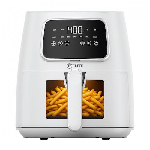 A fritadeira elétrica Kitchen Elite AF550PK é uma air fryer digital de bancada com capacidade de 5,5 litros, indicada para preparar refeições diárias para 2 a 4 pessoas. O cesto comporta porções de batatas fritas, carnes, frango, legumes e lanches diversos em um formato compacto de fácil acomodação na bancada.