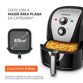 A capacidade de 6 litros é ideal para quem prepara porções maiores, como para famílias ou reuniões, oferecendo o espaço necessário para fritar, assar e grelhar diversos tipos de alimentos. O cesto quadrado, assegura uma distribuição de calor mais uniforme, resultando em alimentos cozidos de maneira perfeita e sem a necessidade de mexer durante o preparo.