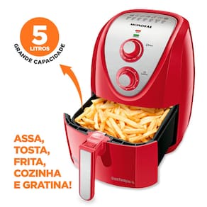 Prepare receitas do café da manhã ao jantar com a Fritadeira Elétrica Fryer Mondial AFN-50-RI. E o melhor: de forma prática, rápida e saudável! A Tecnologia de Circulação de Ar Quente cozinha, frita (a ar), assa ou tosta os alimentos sem precisar adicionar óleo ou manteiga. Aliada à alta potência, a tecnologia da fritadeira sem óleo também possibilita rapidez nos preparos. O cesto quadrado com capacidade de 5 litros acomoda melhor os alimentos, permitindo assar por igual. Seu design é compacto e ocupa espaço reduzido na bancada, além de ser fácil de limpar, pois os alimentos não grudam.A fritadeira elétrica da Mondial possui controle de temperatura até 200°C para que você escolha a temperatura ideal para diferentes tipos de alimentos. Além disso, conta com timer de 60 minutos para maior facilidade e comodidade na hora de selecionar o tempo necessário de preparo das receitas, e aviso sonoro + desligamento automático após o tempo pré-definido no timer.Você conhece as possibilidades de receitas que podem ser feitas na Air Fryer? É possível preparar pão de queijo vegano, peixe, frango à parmegiana, bolinho de arroz, além de pratos doces, como bolo de chocolate, pudim, tortinha de banana, entre outros. É só colocar a criatividade em prática e mãos à obra!Comer bem e saudávelNa correria do dia a dia, dificilmente conseguimos parar para cozinhar e acabamos consumindo alimentos processados e industrializados, deixando de lado hábitos saudáveis de alimentação. Sabemos a importância de preparar refeições com ingredientes naturais e o quanto isso afeta nossa saúde diretamente em vários aspectos. Por isso, é essencial ter utensílios que facilitem nosso dia a dia, nos permitindo comer bem e ainda economizar um tempinho para descansar. Experimente a Fritadeira Elétrica Fryer Mondial AFN-50-RI e prepare suas receitas de maneira saudável e sem adição de gordura!