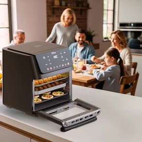 A porta com visor permite acompanhar o preparo sem abrir, mantendo o calor interno. Além disso, a limpeza é fácil e rápida com a porta removível. Com a função Programar, você define o horário do preparo e organiza sua rotina. Já a função Menu Favorito grava seus ajustes preferidos para receitas rápidas.