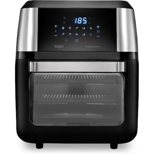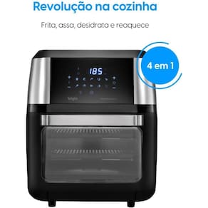 Fritadeira elétrica e forno 4 em 1: assa, frita sem óleo, desidrata e reaquece. Tecnologia Air Circuit para circulação homogênea de ar quente. Painel touch com seletor de temperatura digital. Design moderno com acabamento em inox. Porta removível e bandejas que podem ir na lava-louças. Proteção contra superaquecimento. Base antiderrapante e alça fria.Porta-fio