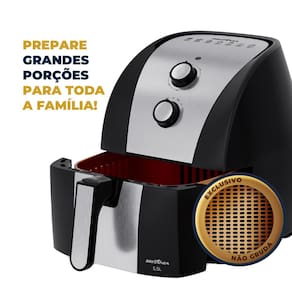 - Capacidade: 5,5 litros - Potência: 1500W - Consumo: 1,5 kWh - Tecnologia Air Flow 360° - Revestimento interno Gold com 4 camadas protetivas - Cesto quadrado, removível e antiaderente - Trava de segurança no cesto - Desligamento automático - Lâmpada piloto - Controle de temperatura: 80°C a 200°C - Timer de até 60 minutos - Acabamento preto com inox - Antiaquecimento externo - Proteção contra superaquecimento - Tipo de tomada: 20A de 3 pinos (110V) e 10A de 3 pinos (220V) - Dimensões: 33 x 28 x 36 cm - Peso: 4,1 kgPorta-fio