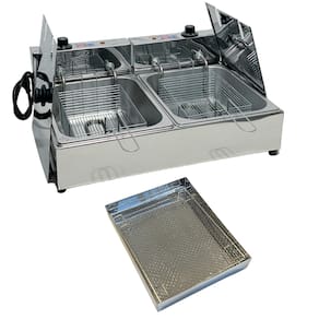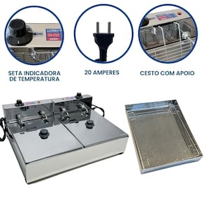 Fritadeira elétrica industrial com 2 cubas independentes de 5 litros cada, escorredor médio, 2 tampas inclusas. Fabricada em inox de alta qualidade. Termostato ajustável de 50°C a 300°C. Ideal para uso comercial e residencial com alta demanda.Porta-fio