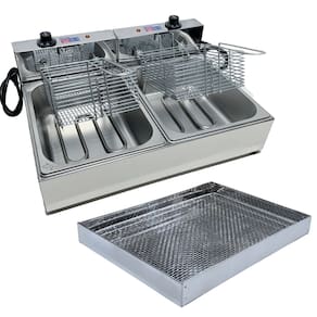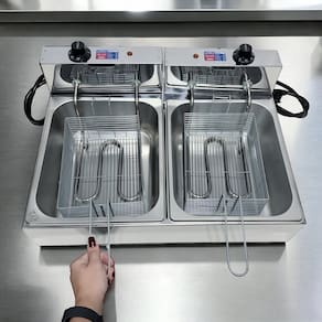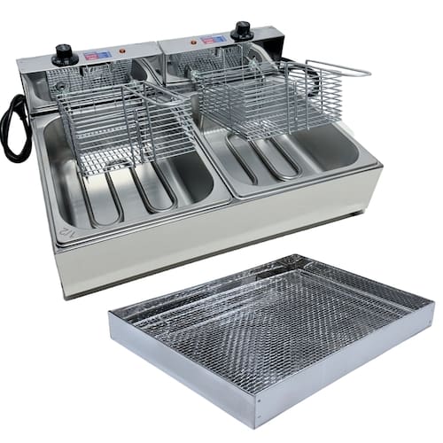 Fritadeira elétrica industrial com 2 cubas independentes de 5 litros cada e escorredor tamanho grande. Fabricada em inox de alta qualidade. Termostato ajustável de 50°C a 300°C. Uso comercial e residencial.Porta-fio