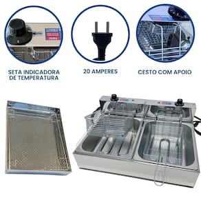 Fritadeira elétrica industrial com 2 cubas independentes de 5 litros cada, permitindo fritar diferentes alimentos simultaneamente. Fabricada em inox de alta qualidade. Termostato ajustável de 50°C a 300°C.Porta-fio