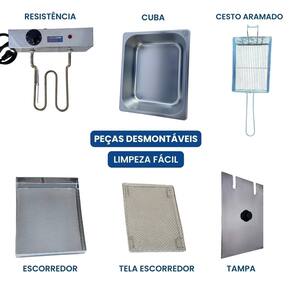 Fritadeira elétrica industrial com 2 cubas de 5 litros cada, escorredor tamanho médio, 2 tampas inclusas. Cuba com capacidade total de 10 Litros (óleo + alimentos). Capacidade de óleo: 2,5 litros cada cuba. Termostato ajustável de 50°C a 300°C. Fabricada em inox de alta qualidade. Uso comercial e residencial.Porta-fio