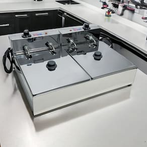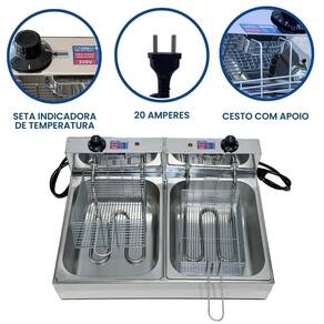 Fritadeira elétrica industrial com 2 cubas independentes de 5 litros cada, totalizando 10 litros. Fabricada em inox de alta qualidade. Possui termostato ajustável de 50°C a 300°C. Inclui tampas para conservação de temperatura e redução de respingos.Porta-fio