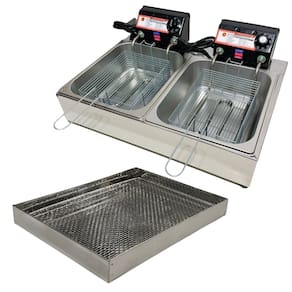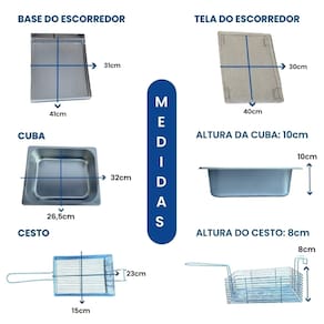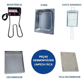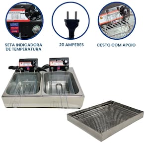 Fritadeira elétrica industrial com 2 cubas independentes de 5 litros cada, sistema antichamas, termostato ajustável de 50°C a 300°C, escorredor tamanho grande.Porta-fio