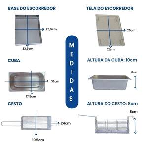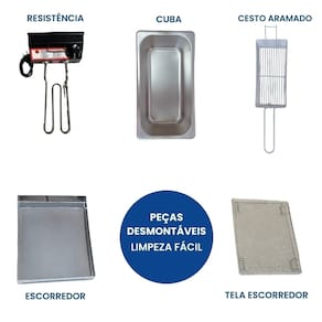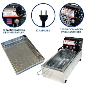 Cuba antichamas, ideal para cozinhas com menor demanda ou espaços reduzidos. Escorredor tamanho M para alimentos mais sequinhos. Termostato ajustável de 50°C a 300°C. Uso Comercial e Residencial.Porta-fio