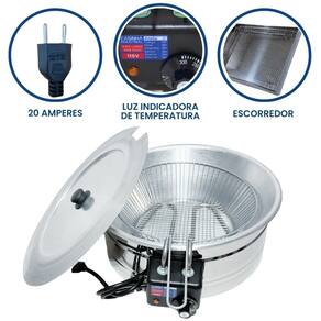 Capacidade Total da Cuba: 10 Litros. Capacidade de Óleo: de 5 a 6 Litros. Termostato Ajustável: De 50°C a 300°C. Aro, Tacho Esmalte e Cabeçote com materiais que garantem a durabilidade. Cesto aramado estanhado. Cabeçote removível. Alça projetada para um melhor escorrimento do óleo.Porta-fio