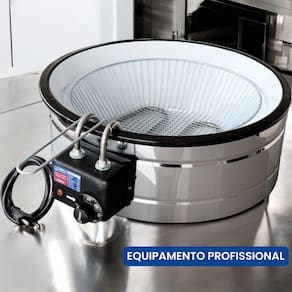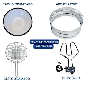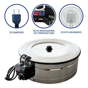 Tacho redondo esmaltado de 10 Litros com tampa, ideal para restaurantes, lanchonetes e cozinhas residenciais de alta produção. Tacho esmaltado resistente à corrosão e fácil de limpar. Termostato ajustável de 50°C a 300°C.Porta-fio