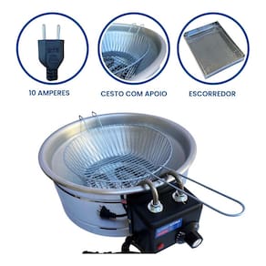Kit Tacho Redondo 5 Litros + Escorredor M. Possui termostato regulável de qualidade e com alça para escorrer o óleo e deixar sua fritura sequinha e com cabos reforçados e qualidade INOX. Uso: Comercial e Residencial.Cesto removível