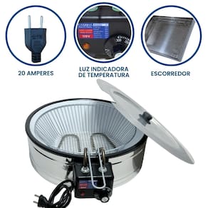 Tacho esmaltado 7 litros com tampa e escorredor grande. Termostato ajustável de 50°C a 300°C. Cabos reforçados em inox. Uso comercial e residencial.Porta-fio
