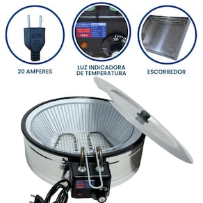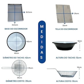 Tacho esmaltado com termostato regulável, alça para escorrer óleo e cabos reforçados em INOX. Inclui escorredor médio e tampa.Porta-fio