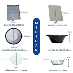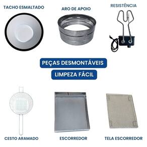Tacho esmaltado com 5 litros de capacidade total e escorredor médio. Termostato regulável de 50°C a 300°C. Cabos e alça em Inox. Uso comercial e residencial.Porta-fio