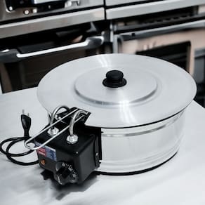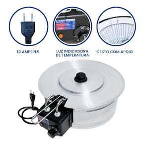 Fritadeira industrial elétrica com tacho redondo de 5 Litros esmaltado com tampa. Indicada para restaurantes, lanchonetes, quiosques e cozinhas residenciais. Tacho revestido com esmalte resistente à corrosão e fácil de limpar. Tampa inclusa para proteção e higiene.Porta-fio