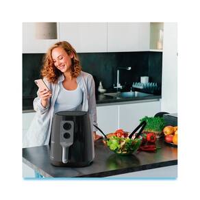 Fritadeira elétrica sem óleo com 3 funções: assar, fritar e descongelar. Possui timer de até 30 minutos e ajuste de temperatura de 80 a 200 °C., Fritadeira elétrica sem óleo com 3 funções: assar, fritar e descongelar. Possui timer de até 30 minutos e ajuste de temperatura de 80 a 200 °C.Porta-fio