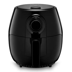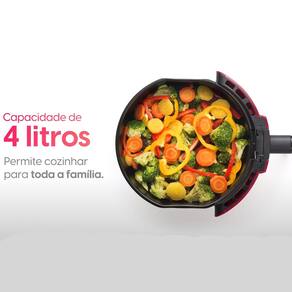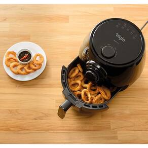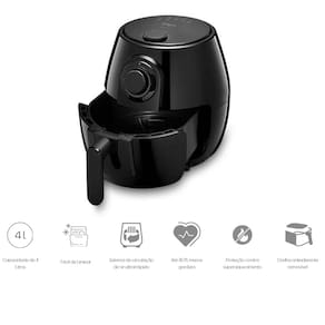 Fritadeira elétrica sem óleo Elgin Quick Fryer com capacidade de 4 litros, potência de 1350W, revestimento antiaderente, sistema de circulação de ar ultrarrápido, controle de temperatura de 80°C a 200°C, timer de 30 minutos, desligamento automático, base antiderrapante e alça fria.Porta-fio