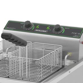 Fritador Elétrico de Mesa fabricado externamente em aço inox escovado 430 e tanque em aço inox 304. Seu painel é removível com resistências blindadas em inox que contam com proteção e bulbo do termostato em aço inox. Essa Fritadeira acompanha termostato para controle de temperatura e segurança, lâmpada piloto que indica o funcionamento da resistência e válvula esfera de escoamento do óleo.