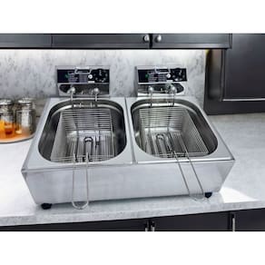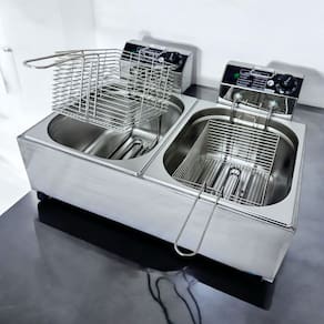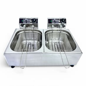 Especificações Técnicas: Voltagem: 220V Capacidade total: 16 litros (8L por cuba) Material: Aço inox de alta resistência 2 cubas de 1/2 x 150 2 cestos individuais Termostato ajustável para controle preciso da temperatura Resistência elétrica de alto desempenho