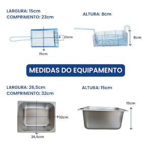 Capacidade Total da Cuba: 7 Litros (incluindo alimentos e óleo) Capacidade de Óleo: de 3,5 a 4 Litros Termostato Ajustável: de 50°C a 300°C, com controle preciso Cabeçote com resistência blindada removível, facilitando a limpeza Cesto de fritura aramado estanhado, para uma fritura uniforme Alça funcional, projetada para escorrimento eficiente do óleo Base e cuba em aço inox, garantindo resistência, durabilidade e segurança
