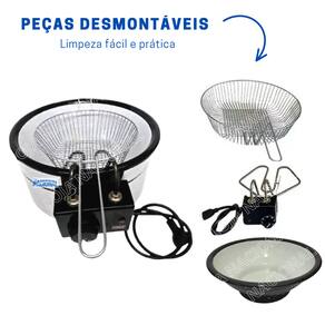 A fritadeira TEPlus – 3L é perfeita para o uso industrial ou doméstico. É compacta, ou seja, não ocupa muito espaço em seu comércio ou cozinha. Sendo fácil de manusear e tocar de lugar.O modelo TEPlus possui 1 cuba com a capacidade total de até 3 litros, sendo óleo + alimento. Possui cesto e cabeçote removíveis que facilitam sua limpeza e conservação.Fabricada com o termostato mais moderno e confiável do mercado elétrico, fritadeira atinge a temperatura esperada em aproximadamente 8 minutos (dependendo do ambiente) e seu termostato controla a temperatura e protege sua fritadeira.Possui resistência em aço inox e blindada fazendo com que esquente somente a parte baixa da resistência, evitando choques e queimaduras.CARACTERÍSTICAS GERAIS- Capacidade Total da Cuba: 3 Litros- Capacidade de óleo: 2 a 2,5 Litros- Termostato de 50°C a 300°C (com regulagem)- Material: Aço Inoxidável- Voltagens 110v e 220v (NÃO É BIVOLT) – Escolher a voltagem no anúncio- Lâmpada piloto de aquecimento (Indicativo de Acionamento Automático)- Cuba gastronômica esmaltada na cor branca- Cesto de FrituraInstruções Rápidas:- O controle de temperatura segue a linha da lâmpada de aquecimento. Na dúvida de onde ligar, ouça o "Click".- A fritadeira está ligada quando o piloto acender (luz vermelha);- Nunca ligar a fritadeira sem óleo;- Cuidado com a temperatura acima de 200 graus, pode ocorrer queima do óleo;- Para testar a quantidade de óleo, faça a MEDIÇÃO COM ÁGUA e com a fritadeira DESLIGADA. Feito a medição da quantidade, retire a água e seque bem a cuba. JAMAIS LIGUE A FRITADEIRA COM ÁGUA E NEM MISTURE ÁGUA E ÓLEO;- Quando a temperatura indicada for atingida, o piloto se apaga e a fritadeira está pronta para ser usada;- A operação de imersão deve ser lenta para que evite que o óleo transborde;- Manter sempre 2 litros de óleo na cuba, isto é, repor quando o nível baixar. A frequência de troca do óleo depende da utilização.Informações técnicas:- 110V – 1.600 Watts- 220V – 1.600 Watts- Tomada: 10A- Medidas da Fritadeira.=> Cuba profundidade: 9,5 cm x Diâmetro Cima: 27 cm x Diâmetro base: 17=> Base Altura: 12 cm x Diâmetro: 29 cm- Uso Comercial e Residencial- Não incluso tampaCONTEÚDO DA EMBALAGEM- 01 Base em aço inox - 01 cabeçote com resistência- 01 cesto aramado- 01 cuba esmaltada na cor branco- 01 Manual de instruçõesPERGUNTAS FREQUENTES:As partes são removíveis?- Sim, todas as partes (cabeçote, cesto, cuba) são removíveis.Quantos graus atinge?- de 50 a 300 grausQuantos litros de óleo?- de 2L a 2,5 Litros (sobrando espaço para os alimentos)Posso fritar quais tipos de alimentos?- Quaisquer tipos de alimentos. Salgados, pastel, kibe, mandioca, calabresa, batata, peixes dentre outros.O cesto é aramado?- SimA cuba é esmaltada?- Sim, na cor brancoA tomada é normal?- O plugue é o de 10APode ligar diretamente na tomada de casa?- Sim, qualquer tomada normal Quantos watts utiliza?- Utiliza 1600W nas duas voltagens, 127v e 220v