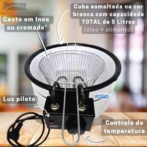 A fritadeira TEPlus – 5L é perfeita para o uso industrial ou doméstico. É compacta, ou seja, não ocupa muito espaço em seu comércio ou cozinha. Sendo fácil de manusear e tocar de lugar.O modelo TEPlus possui 1 cuba com a capacidade total de até 5 litros, sendo óleo + alimento. Possui cesto e cabeçote removíveis que facilitam sua limpeza e conservação.Fabricada com o termostato mais moderno e confiável do mercado elétrico, fritadeira atinge a temperatura esperada em aproximadamente 8 minutos (dependendo do ambiente) e seu termostato controla a temperatura e protege sua fritadeira.Possui resistência em aço inox e blindada fazendo com que esquente somente a parte baixa da resistência, evitando choques e queimaduras.CARACTERÍSTICAS GERAIS- Capacidade Total da Cuba: 5 Litros (óleo + alimentos)- Capacidade de óleo: 3 a 3,5 Litros- Termostato de 50°C a 300°C (com regulagem)- Material: Aço Inoxidável e Ferro Esmaltado na cor Branco- Voltagens 110v e 220v (NÃO É BIVOLT) – Escolher a voltagem no anúncio- Lâmpada piloto de aquecimento (Indicativo de Acionamento Automático)- Cuba gastronômica esmaltada na cor branca- Cesto de FrituraInstruções Rápidas:- O controle de temperatura segue a linha da lâmpada de aquecimento. Na dúvida de onde ligar, ouça o "Click".- A fritadeira está ligada quando o piloto acender (luz vermelha);- Nunca ligar a fritadeira sem óleo;- Cuidado com a temperatura acima de 200 graus, pode ocorrer queima do óleo;- Para testar a quantidade de óleo, faça a MEDIÇÃO COM ÁGUA e com a fritadeira DESLIGADA. Feito a medição da quantidade, retire a água e seque bem a cuba. JAMAIS LIGUE A FRITADEIRA COM ÁGUA E NEM MISTURE ÁGUA E ÓLEO;- Quando a temperatura indicada for atingida, o piloto se apaga e a fritadeira está pronta para ser usada;- A operação de imersão deve ser lenta para que evite que o óleo transborde;- Manter sempre 3 litros de óleo na cuba, isto é, repor quando o nível baixar. A frequência de troca do óleo depende da utilização.Informações técnicas:- 110V – 1.600 Watts- 220V – 1.600 Watts- Tomada: 10A- Medidas da Fritadeira.=> Cuba profundidade: 12,5 cm x Diâmetro Cima: 30 cm x Diâmetro base: 17,5 cm=> Base Altura: 12 cm x Diâmetro: 31 cm- Uso Comercial e Residencial- Não incluso tampaCONTEÚDO DA EMBALAGEM- 01 Base em aço inox - 01 cabeçote com resistência- 01 cesto aramado ou cromado (sem opção de escolha)- 01 cuba esmaltada na cor branco- 01 Manual de instruçõesPERGUNTAS FREQUENTES:As partes são removíveis?- Sim, todas as partes (cabeçote, cesto, cuba) são removíveis.Quantos graus atinge?- de 50 a 300 grausQuantos litros de óleo?- de 3L a 3,5 Litros (sobrando espaço para os alimentos)Posso fritar quais tipos de alimentos?- Quaisquer tipos de alimentos. Salgados, pastel, kibe, mandioca, calabresa, batata, peixes dentre outros.Posso fritar pastel?- Sim, desde pastéis pequenos, onde é necessário utilizar o cesto, até pastéis de 28 cm, onde não se utiliza o cesto.O cesto é aramado ou cromado?- Temos as 2 opções de cesto, dependendo da disponibilidade e sem opção de escolha.A cuba é esmaltada?- Sim, na cor brancoA tomada é normal?- O plugue é o de 10APode ligar diretamente na tomada de casa?- Sim, qualquer tomada normal Quantos watts utiliza?- Utiliza 1600W nas duas voltagens, 127v e 220v