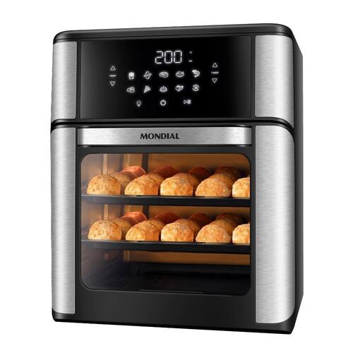 Fritadeira Eletrica Air Fryer Mondial Oven AFO-12L-BI 12L 2000W. Prepara alimentos de forma mais prática, além de fritar sem óleo, assa, cozinha e gratina. Possui 10 funções predefinidas e tecnologia de circulação de ar quente. Cesto e assadeiras com antiaderente Duraflon.Porta-fio