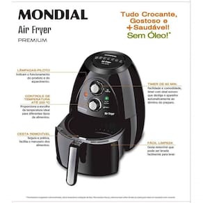 Fritadeira elétrica Mondial Premium AF-05 com capacidade de 2,7L, potência de 1500W, temperatura até 200°C, timer de 60 minutos, revestimento antiaderente, aviso sonoro e desligamento automático.Porta-fio