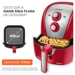 Capacidade de 4 litros + cesto quadrado: considerado o cesto com a maior área plana da categoria*, ele acomoda melhor os alimentos, permitindo assar e fritar por igual.