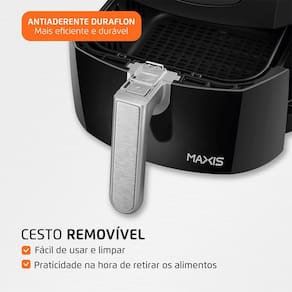 Fritadeira elétrica sem óleo Mondial Maxis AF-01-MX com capacidade de 4 litros, controle de temperatura até 200°C, timer de 60 minutos, cesto antiaderente removível, lâmpadas piloto e desligamento automático.Porta-fio