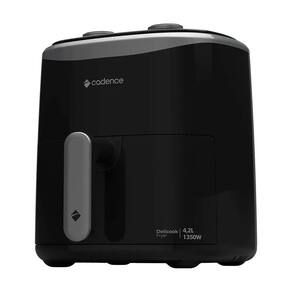 Fritadeira sem óleo Cadence Delicook Fryer com capacidade de 4,2L, potência de 1350W, timer de 60 minutos, temperatura ajustável de 80°C a 200°C, visor transparente, grelha removível e sistema antiaderente.Porta-fio