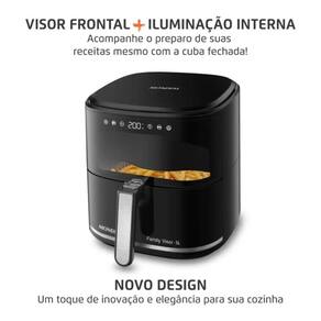A Air Fryer Grand Family Digital Visor Mondial oferece praticidade e recursos modernos em um único aparelho. Com visor frontal transparente e iluminação interna, permite visualizar o preparo mesmo com a cuba fechada. Seu painel digital touch proporciona controle preciso de tempo e temperatura. Com capacidade de 5 litros, o modelo apresenta excelente aproveitamento de espaço e cozimento uniforme. A potência de 2.000W favorece agilidade nas preparações do dia a dia.