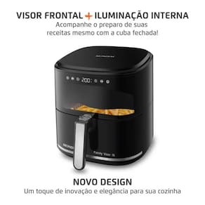 A Air Fryer Grand Family Digital Visor Mondial oferece praticidade e inovação em um único aparelho. Seu visor frontal com iluminação interna permite acompanhar as etapas do preparo com a cuba fechada. Possui painel digital touch para controle preciso de tempo e temperatura, além de um design moderno com acabamento elegante. Com capacidade de 5 litros e potência de 2.000W, proporciona preparo eficiente e distribuição uniforme do ar quente.