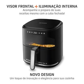 VISOR FRONTAL + ILUMINAÇÃO INTERNA: Com a Air Fryer Grand Family Digital Visor você consegue acompanhar o preparo de suas receitas mesmo com a cuba fechada. O visor transparente e a iluminação interna possibilitam verificar cada etapa do cozimento até atingir o ponto desejado. Isso proporciona mais praticidade e agilidade no seu dia a dia!