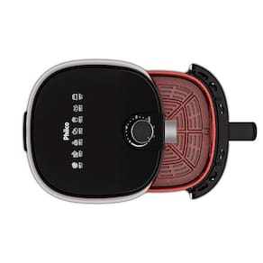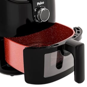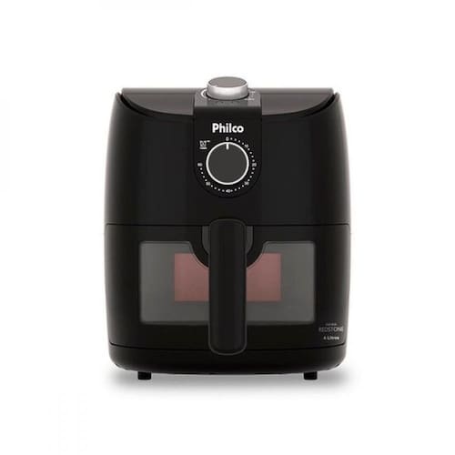 Fritadeira sem óleo Philco com capacidade de 4 litros, 1500W de potência, revestimento Redstone antiaderente, timer de 60 minutos, controle de temperatura de 80°C a 200°C, proteção contra sobreaquecimento e visor glass com iluminação interna.Porta-fio