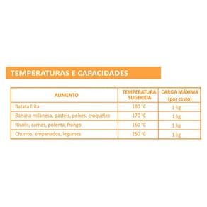 - Queimadores em Aluminio Fundido de alta potência que proporcionam rápida recuperação de temperatura, essencial para frituras com qualidade.