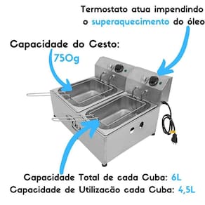 A fritadeira elétrica spolu foi desenvolvida para frituras com alta qualidade em bares, restaurantes, eventos, hotéis e até mesmo residências. Possui cuba com capacidade total de 6l cada cuba e capacidade indicada para 4,5l de óleo cada cuba. Seu tanque é confeccionado em aço inoxidável, que oferece fácil limpeza. Possui cesto em aço carbono cromado, seu termostato atua impendindo o superaquecimento do óleo e acompanha luz que indica quando o óleo atingiu a temperatura escolhida no termostato. A fritadeira elétrica é ideal para qualquer tipo de fritura, principalmente porções, congelados, pastéis e etc. Produtos spolu - conceito de qualidade. Dados do produto: Marca: spolu Modelo:fritadeira elétrica - 2 cubas 220v e 110v Cor predominante:preto/prata Material predominante :inox e aço carbono Dimensões do produto sem embalagem: Altura: 330mm Largura: 560mm Comprimento: 40,5mm Peso: 6,34kg Potência: 3000w Termostato:50ºc a 200c Alimentação: 110v ou 220v Capacidade total:6l cada cuba - total 12l Capacidade de utilização:4,5 l cada cuba - total 9l - indicado pelo fabricante : 6 meses Itens inclusos na embalagem:fritadeira elétrica, cesto cromado, manual de instruções. Marca: Não Informado