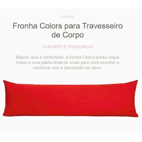 Fronha Avulsa Poliéster Hug Colors 40x130cm Vermelho Lavive Contém: 1 Fronha com Zíper para Travesseiro de Corpo Medidas: 40cm x 130cm Composição: 100% Poliéster Marca: Lavive Garantia de Fábrica Imagens meramente ilustrativas, acessórios não acompanham o produto Informamos que as cores do produto podem variar um pouco de acordo com as configurações do seu computador