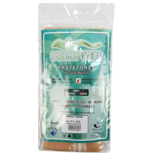 Fronha que envolve o travesseiro completamente, protegendo e impedindo a passagem de ácaros; A Fronha para Travesseiro com Ziper Siliconizado - Senior Care possui zíper, facilitando seu fechamento; Produto antialérgico e lavável. Composição: Produto 100% confeccionado em PVC. Medidas: 0,52 X 0,70m. Cores: Bege. DADOS TÉCNICOS Fabricante: SENIOR CARE Garantia: 1 meses Embalagem: 15x5x25cm (Largura X Altura X Profundidade) Peso: 0.100kg Quantidade de itens na embalagem: 1
