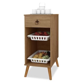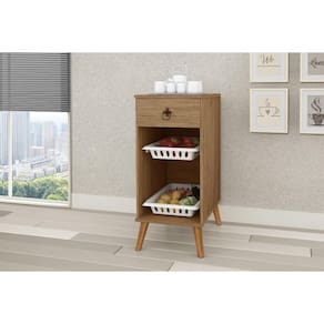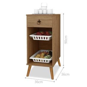 Elaborada em MDP de 15 mm, possui 2 cestos para frutas, 01 gaveta com corrediça metálica e puxador de plástico e pés de plástico.