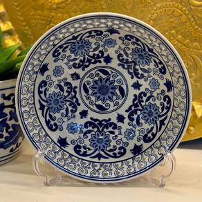 A borda da fruteira é adornada com círculos vazados, proporcionando uma leveza visual e um charme especial ao seu formato. O padrão azul, que lembra o estilo tradicional, contrasta com o fundo branco, criando um efeito visual encantador e vibrante.