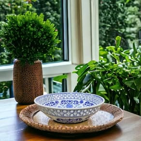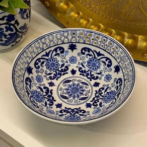 Fruteira centro de mesa saladeira porcelana azul branca 26x9 Esta deslumbrante fruteira em porcelana azul e branca é o centro das atenções em qualquer mesa. Seu design clássico combina a delicadeza da porcelana com um toque contemporâneo, destacando ricos detalhes que refletem a habilidade artesanal.