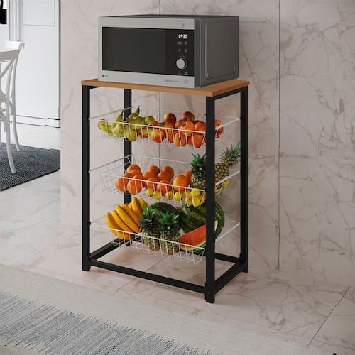 Fruteira Com Suporte Para Micro-Ondas Barcelona Aço Preto Cesto Branco Tampo CanelaA Fruteira Suporte de Micro-ondas Barcelona possui 3 cestos estilo gaveta, para o armazenamento de frutas e legumes e ainda possui tampo de MDF na parte superior, livre para colocar objetos de decoração, utensílios e ela é ideal para colocar seu micro-ondas. A Fruteira fica linda em qualquer tipo de cozinha. Facilitando na organização e na praticidade do dia a dia.Tipo: Fruteira Suporte para Micro-ondas Modelo: BarcelonaCor Base: Preto Cor Cesto: Branco Cor Tampo: Canela Quantidade de Volumes: 3A Fruteira vai desmontada e acompanha manual para montagem.Medidas:Altura: 83,5cmLargura: 63cmComprimento: 35cmATENÇÃOIMAGENS MERAMENTE ILUSTRATIVAS REALIZADO EDIÇÃO, PODENDO HAVER UMA PEQUENA VARIAÇÃO DE COR DEPENDENDO DE CADA TELA OU MONITOR.Fruteira com Suporte para Micro-ondas Barcelona AÃo Preto Cesto Branco Tampo Canela