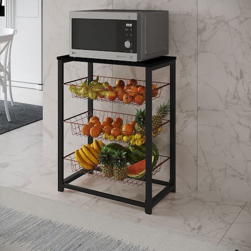 Fruteira Com Suporte Para Micro-Ondas Barcelona Aço Preto Cesto Cobre Tampo Preto A Fruteira Suporte de Micro-ondas Barcelona possui 3 cestos estilo gaveta, para o armazenamento de frutas e legumes e ainda possui tampo de MDF na parte superior, livre para colocar objetos de decoração, utensílios e ela é ideal para colocar seu micro-ondas. A Fruteira fica linda em qualquer tipo de cozinha. Facilitando na organização e na praticidade do dia a dia.