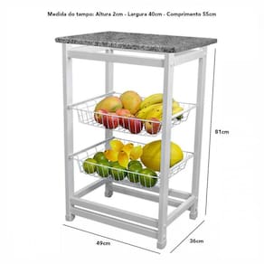 Altura: 81 cm Largura: 49 cm Profundidade: 36 cm Marca: Utilaço Material: Aço Tampo: Em granito Acabamento: Pintura Epóxi Quantidade de Cestos: 02 ( Aço Aramado) Suporta forno micro-ondas ou bebedouro: Sim Pés com ponteiras plásticas Garantia: 3 meses
