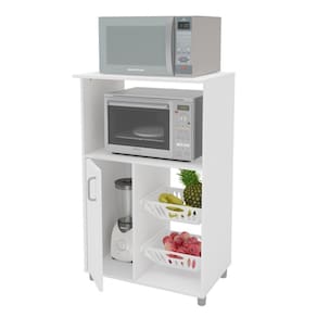 Comporta micro-ondas de 20 litros ou fornos elétricos de 34 litros, possui espaço fechado para guardar mantimentos ou utensílios e serve como fruteira